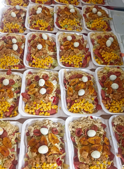 3 Salchipapas grandes para dos personas cada una: Papas a la francesa, salchicha, lechuga, queso, salsa de la casa, ripio, maicitos, chicharrón, maduritos, chorizo, pollo, 2 huevos de codorniz.