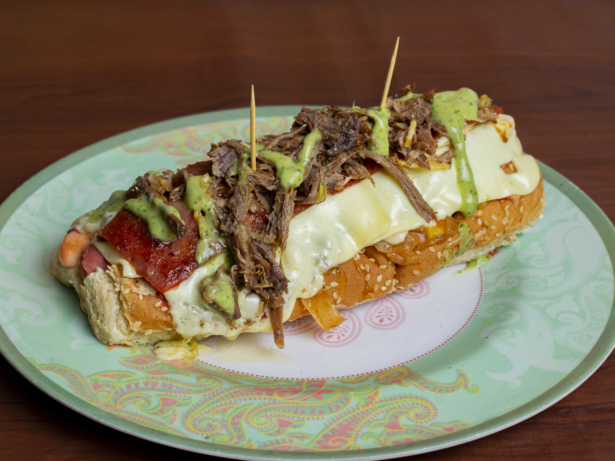 Pan, lechuga, ripio, salchicha americana, cebolla en salsa de la casa, piña calada, maicitos, carne desmechada, tocineta y queso fundido.