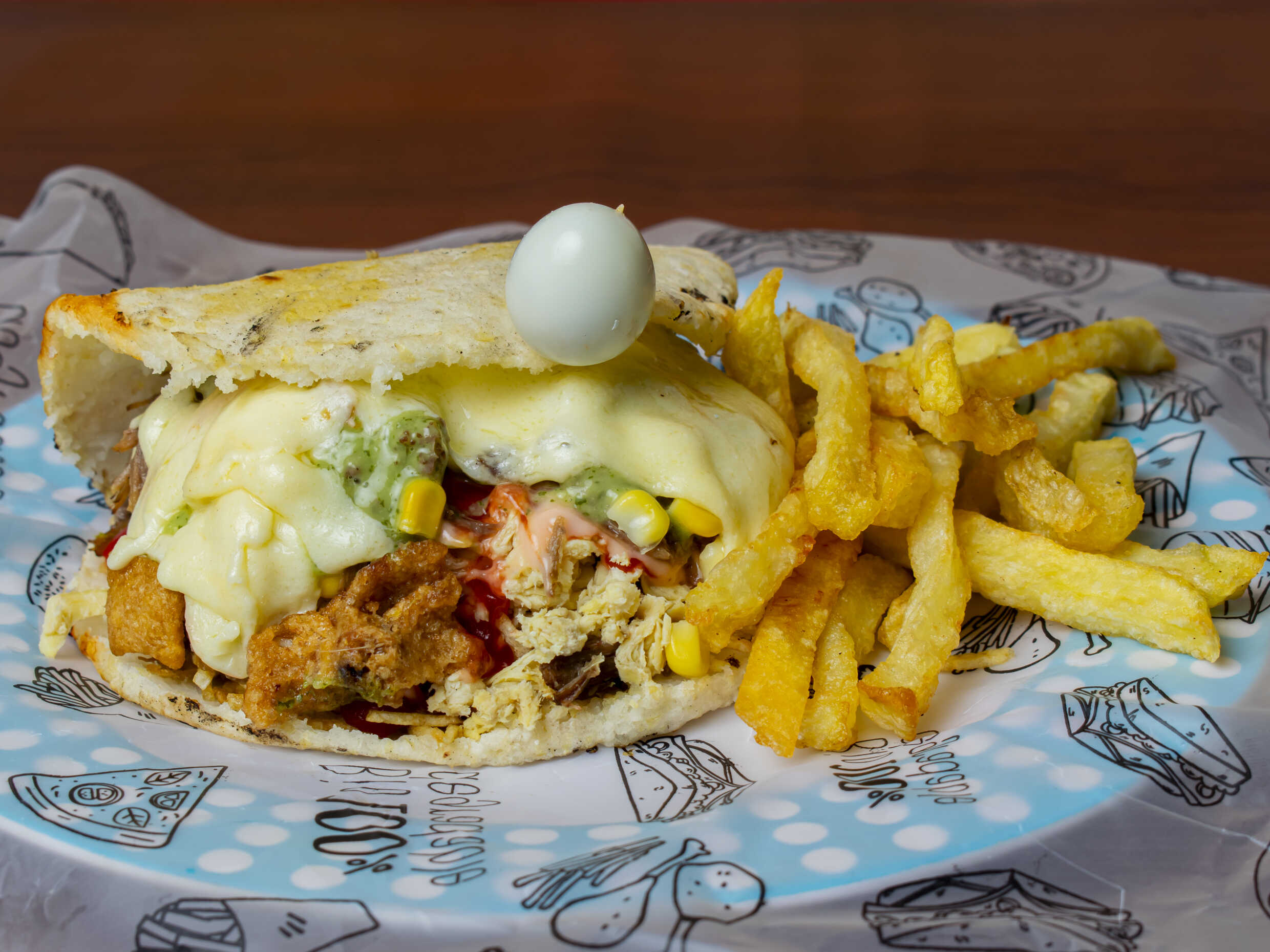 Papasa la francesa, salchicha, lechuga, queso, salsa de la casa, ripio, maicitos, chicharrón, maduritos, chorizo, pollo, huevo de codorniz.