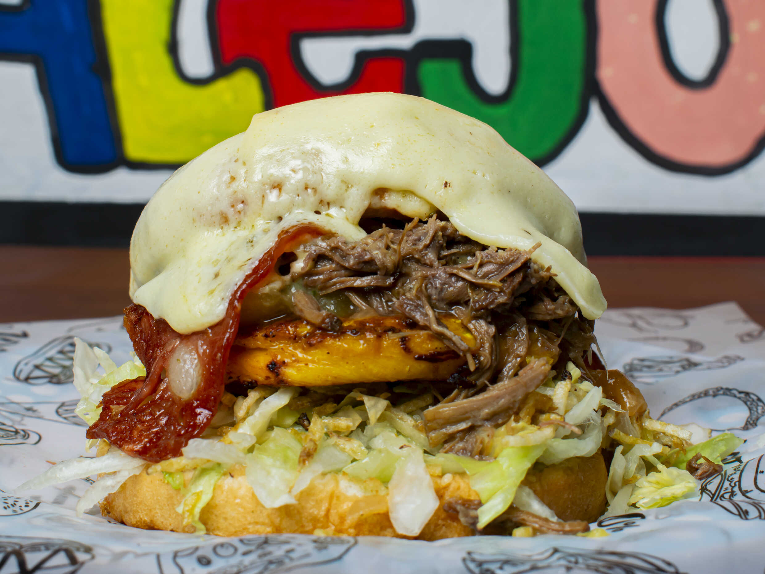Pan, lechuga, ripio, pollo apanado, carne desmechada, tocineta, piña calada, cebolla, queso fundido y tomate.