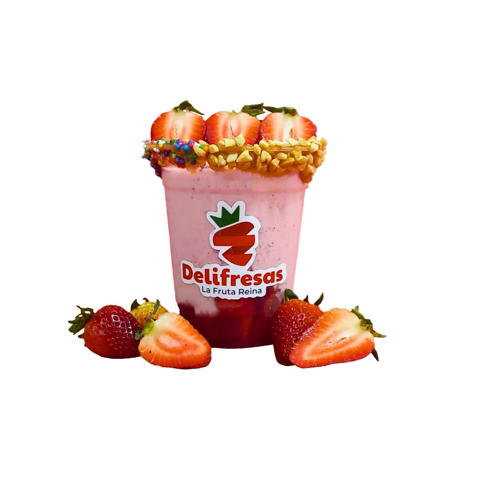 Batido de fresa, una mezcla cremosa, trozos de fresa fresca y nuestra mermelada de fresa artesanal, michelada con arequipe con grajeas de colores, coco rallado, y maní.