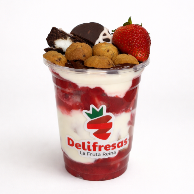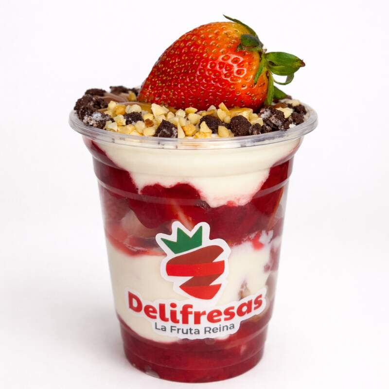 Fresas frescas con crema de la casa y mermelada artesanal, deliciosa combinación de oreo triturada, maní, salsa de arequipe y nutella, vaso de 12 oz.