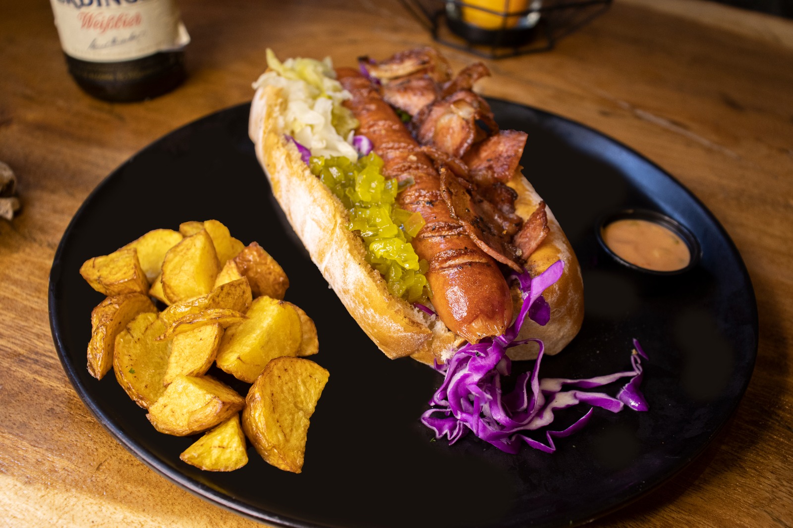Pan brioche artesanal, salchicha alemana tipo káiser, doble tocineta, pepinillos, cebolla encurtida o chucrut a elección.
