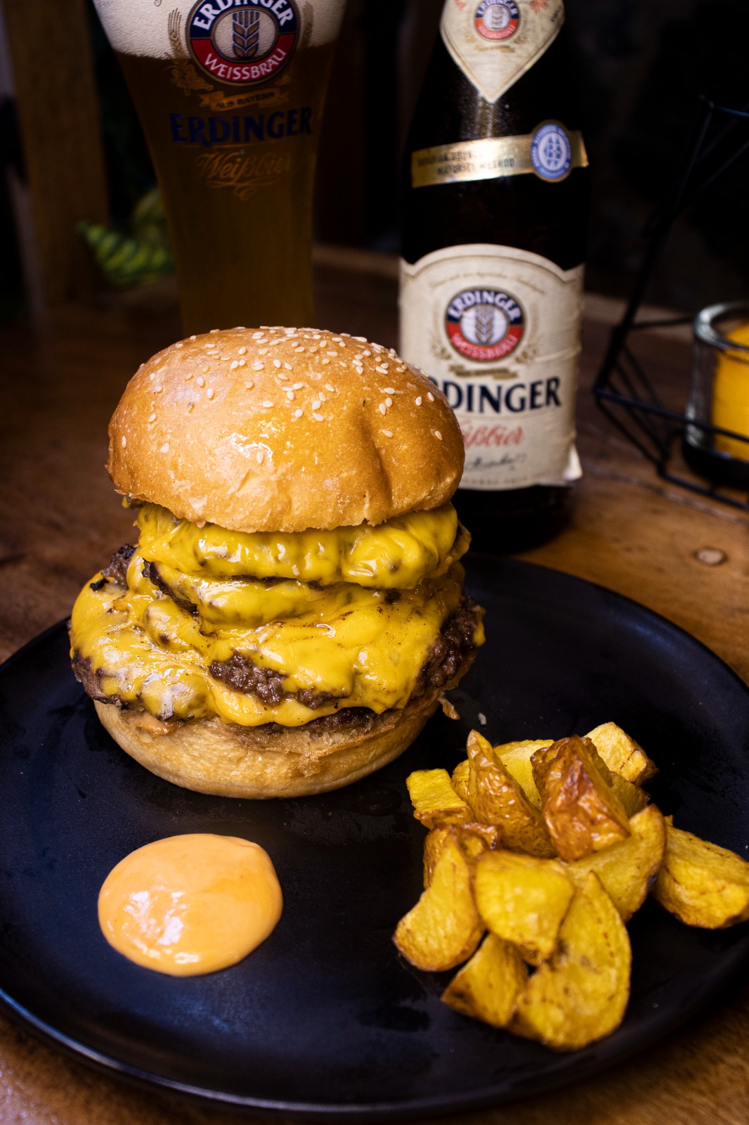 Pan brioche artesanal, carne 100% artesanal 300 g, queso cheddar y salsa de la casa.