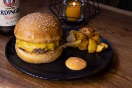 Pan brioche artesanal, carne 100% artesanal 200 g, queso cheddar y salsa de la casa.