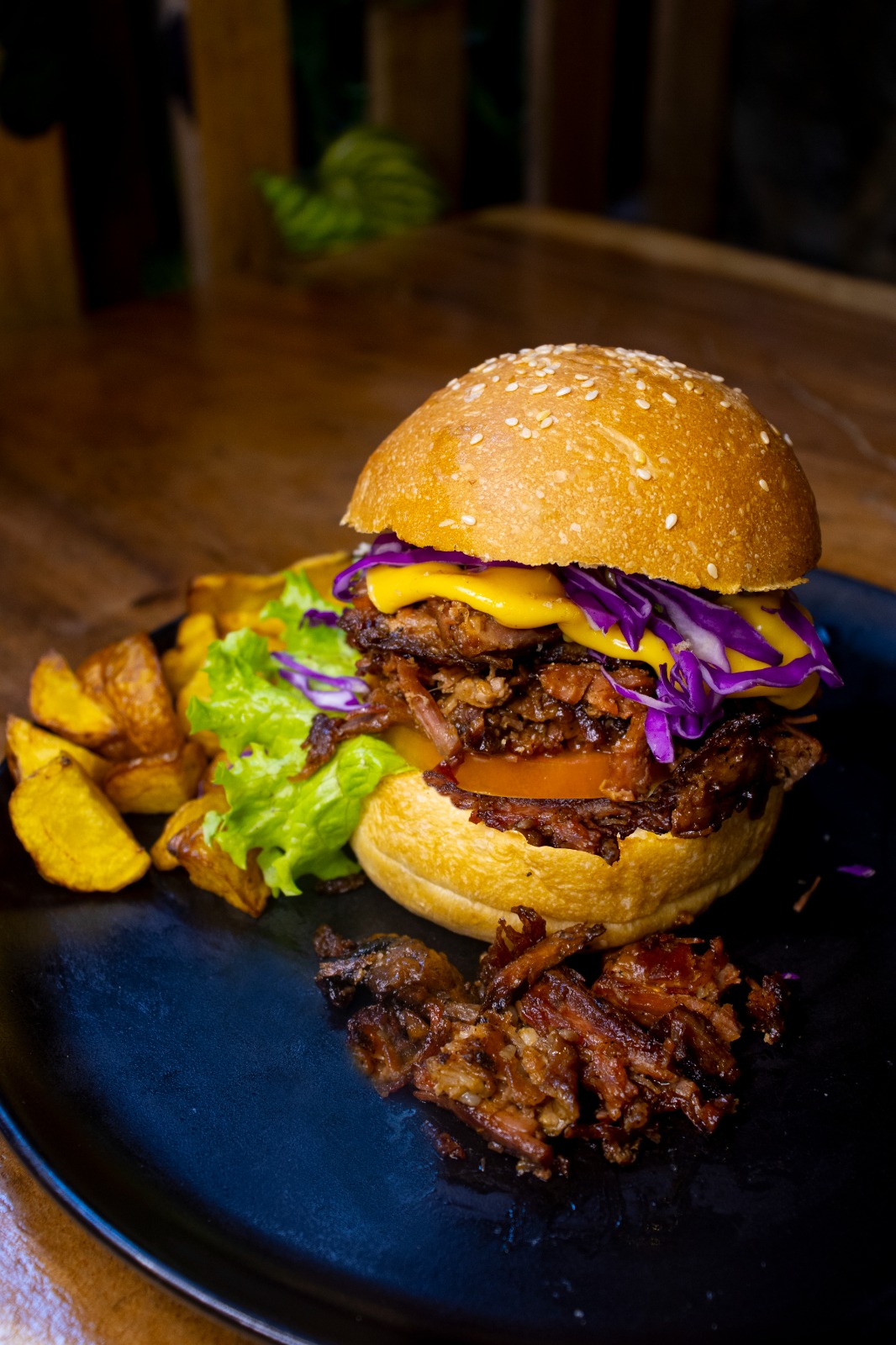 200 g De pulled pork, lechuga, tomate, cebolla morada encurtida, queso cheddar y salsa de la casa.