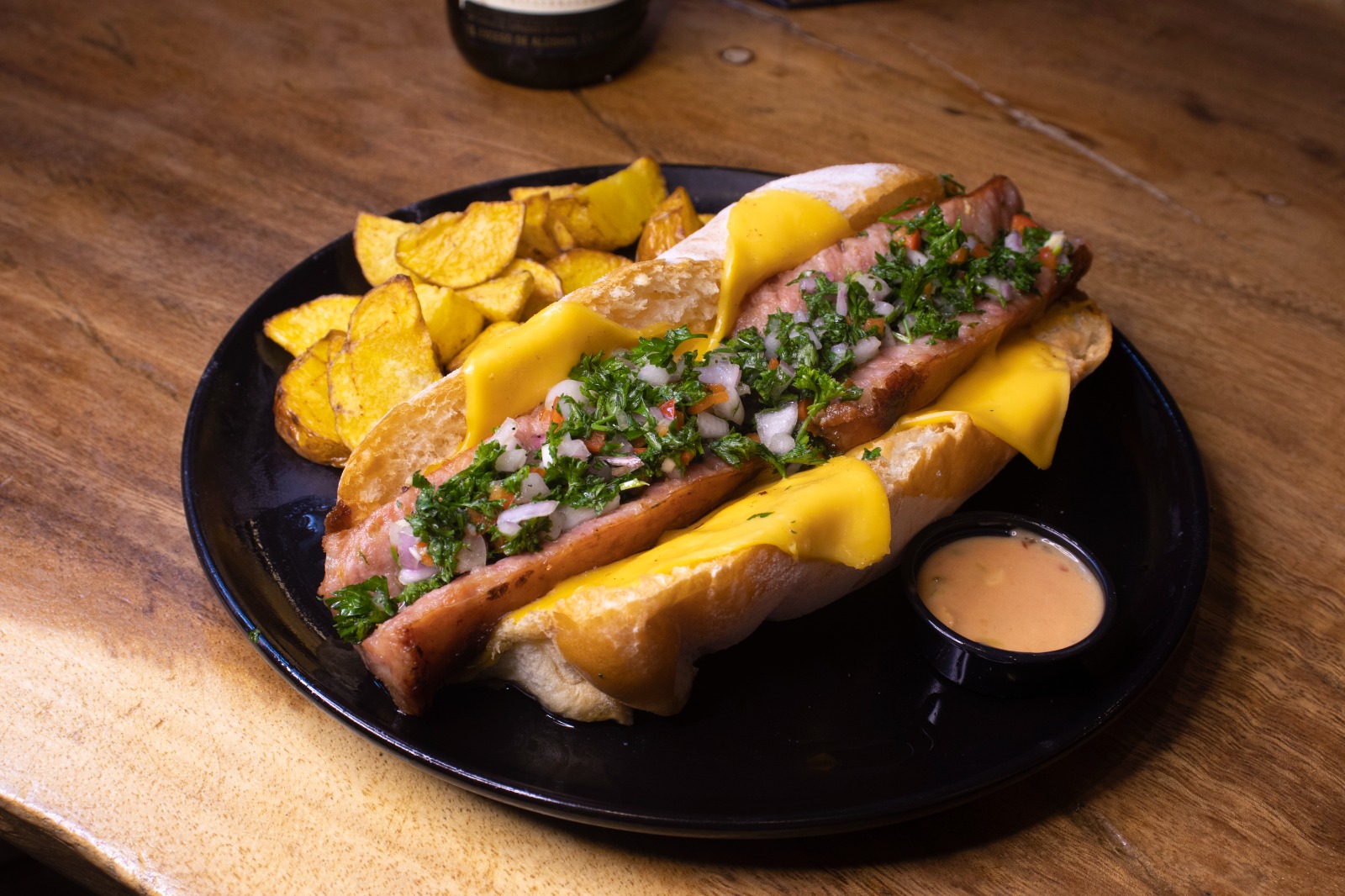 Chorizo de cerdo artesanal, pan brioche a la plancha y chimichurri.