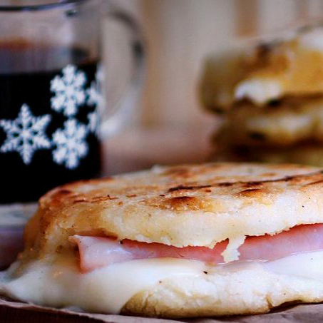 Combo Arepa con Jamón y Queso acompañado de un delicioso Café con Leche.