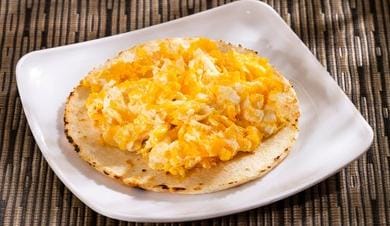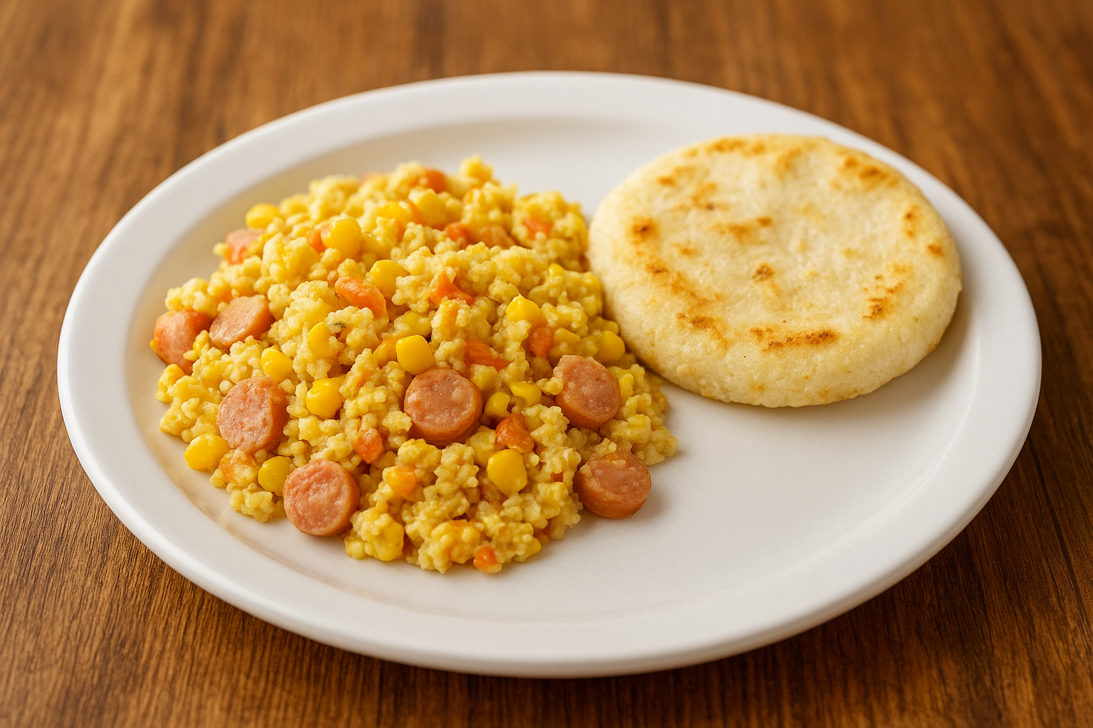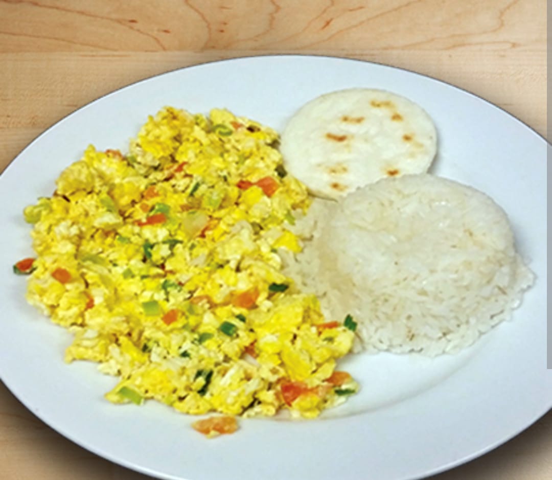 Deliciosos huevos revueltos acompañados de arroz, arepa y café.