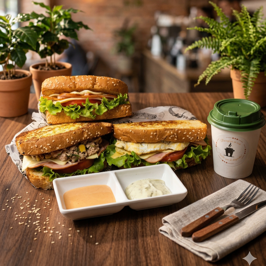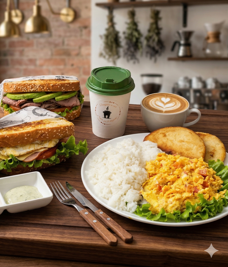 El desayuno completo que incluye un plato de desayuno, un sándwich clásico y café o chocolate.