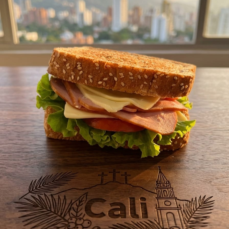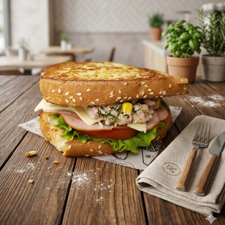 Pan fresco relleno de jamón, queso derretido, rodajas de tomate y lechuga fresca.