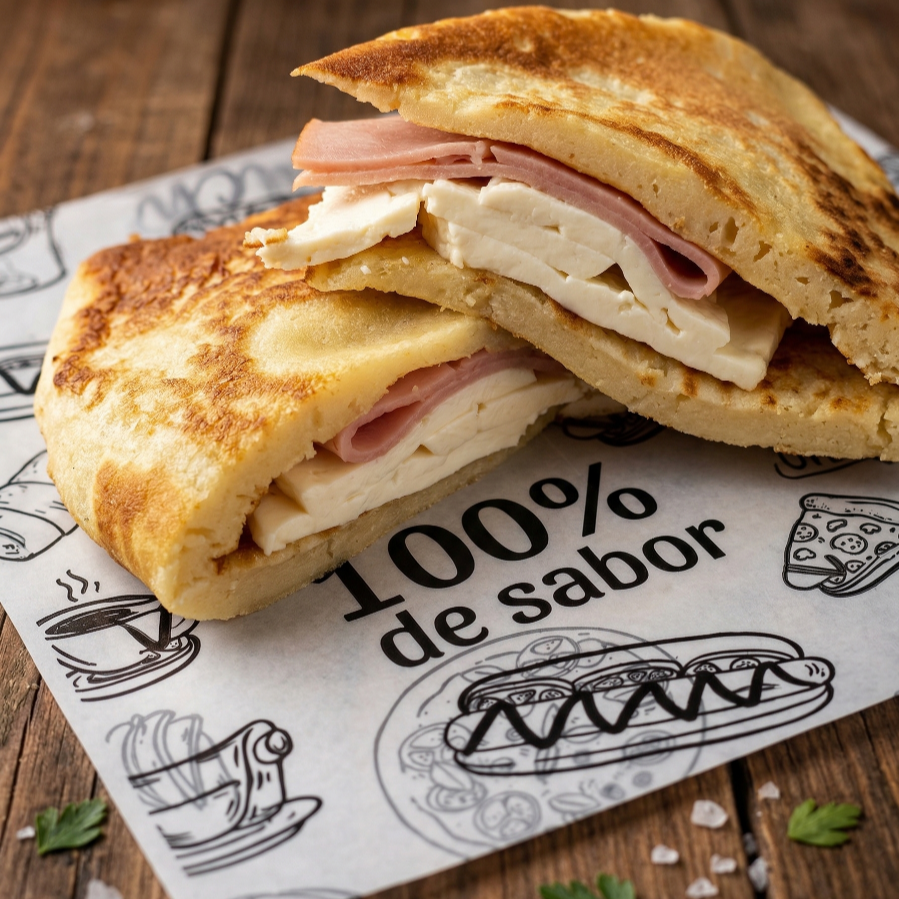 Panqueques esponjosos rellenos de jamón y queso costeño, servidos con un toque de mantequilla.