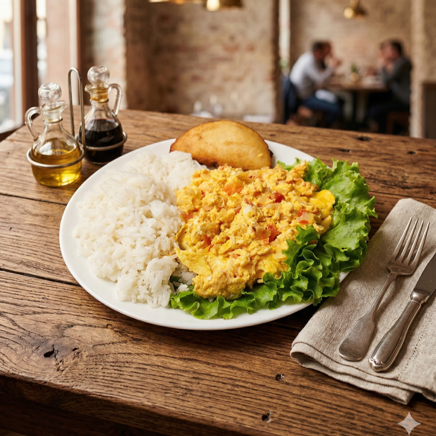 Suaves huevos revueltos servidos con arroz blanco suelto y una deliciosa empanada de la casa.