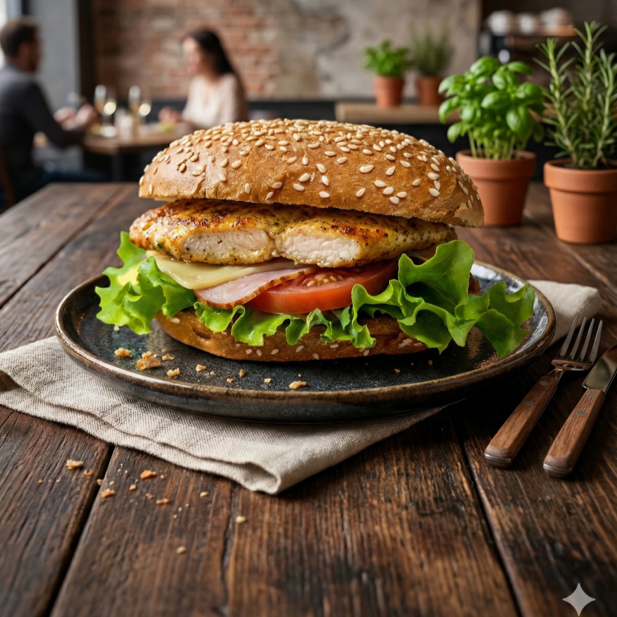 Delicioso pan con pechuga apanada crujiente, jamón, queso, tomate y lechuga.