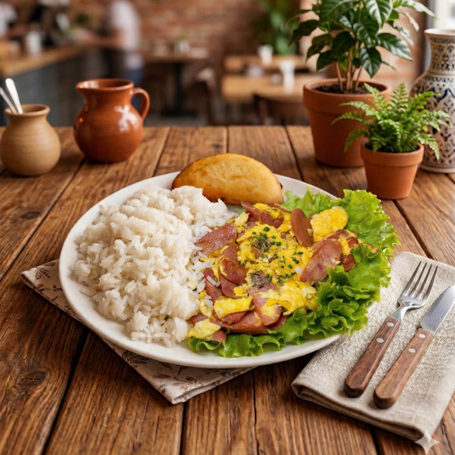 Nutritiva combinación de huevos con atún, servidos con arroz blanco y una empanada tradicional.