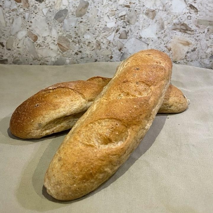 Masa artesanal integral con avena, ajonjolí, linaza, chía y uvas pasas.