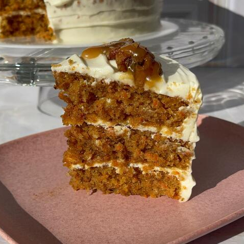 Ponqué de zanahoria, relleno de caramelo salado, cubierto con frosting de queso crema y nueces garrapiñadas! este pastel ha llegado para conquistar tu paladar!.