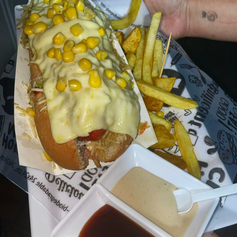Pan perro, salchicha americana, ripio, cebolla caramelizada, doble queso, salsa de la casa, jamón, tocineta, maíz dulce y porción de papa.