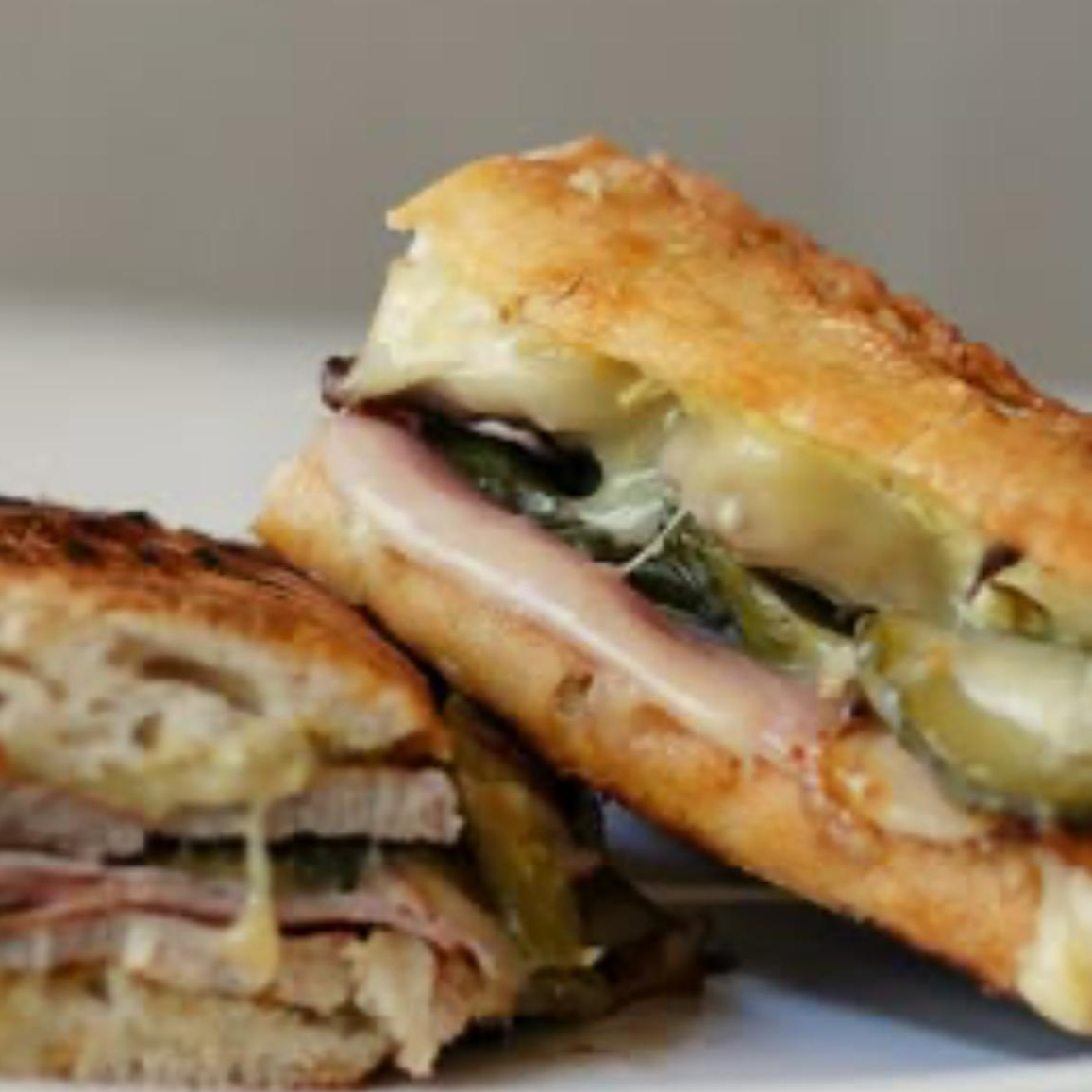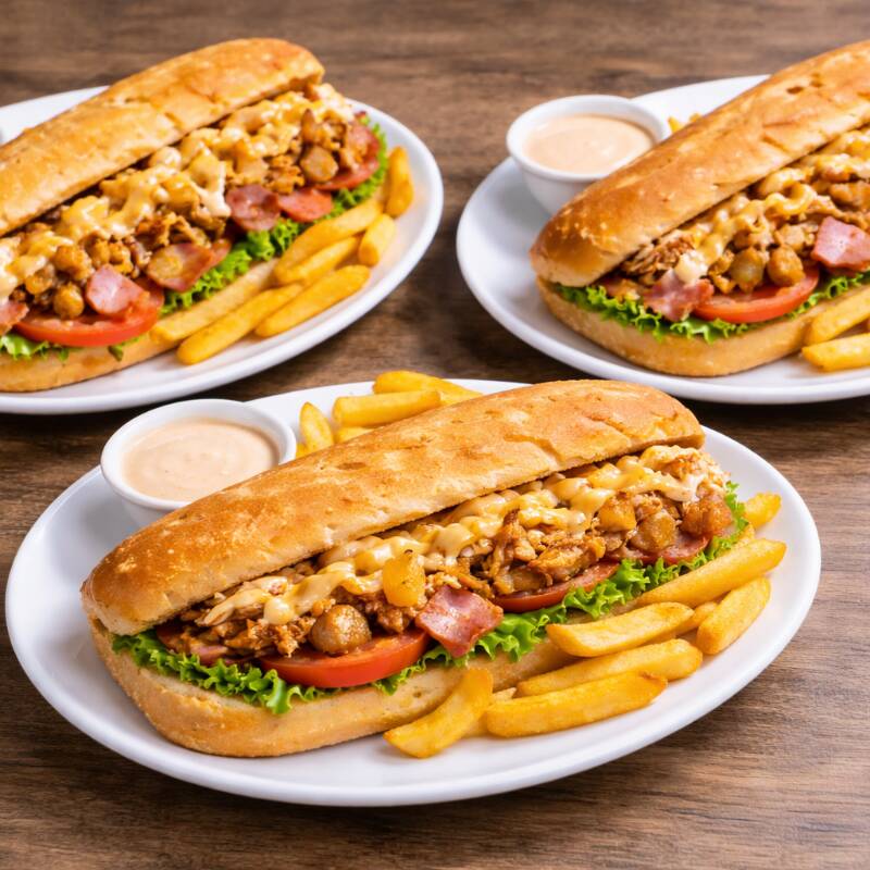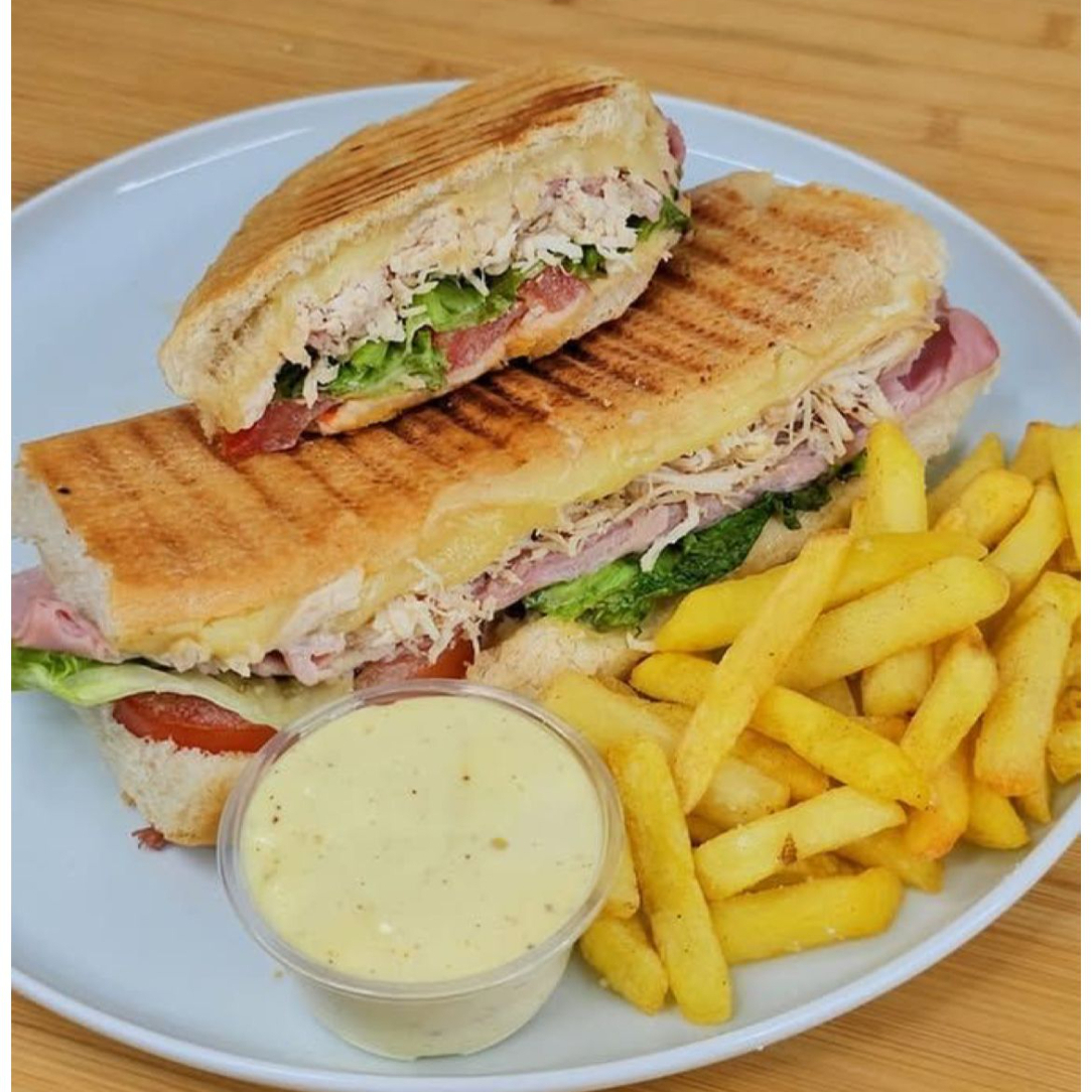 Pan colita, lechuga, tomate, piña caramelizada, jamón, queso, pollo desmechado, porción de papa y salsa de la casa.