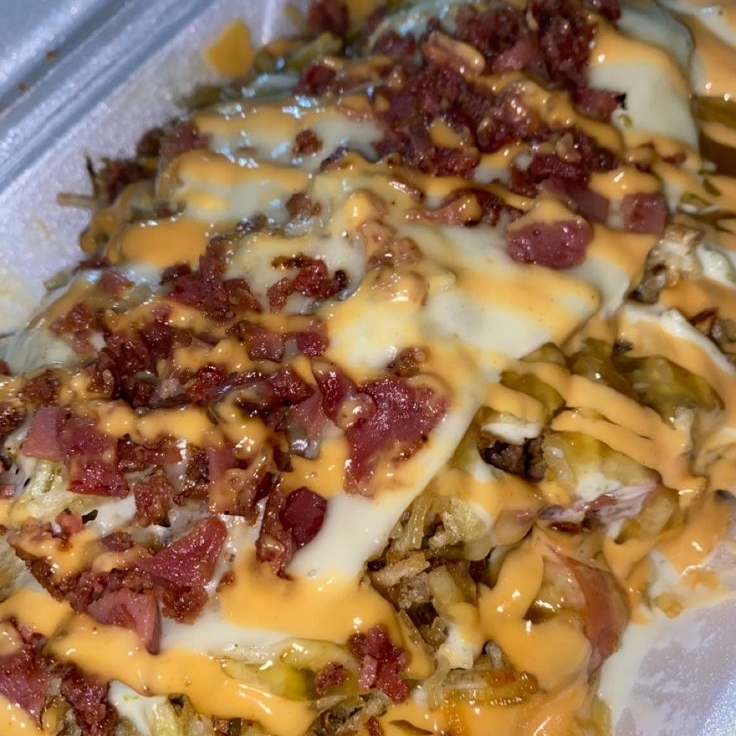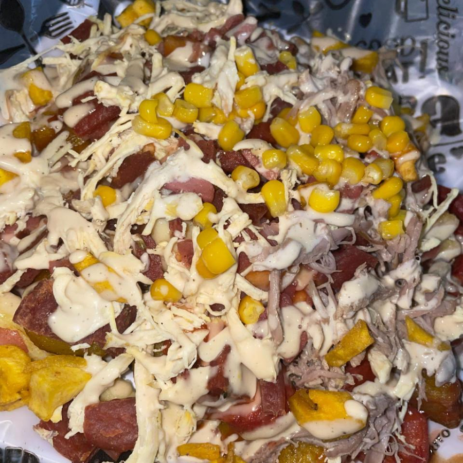 Papa amarilla, papa francesa, salchicha ahumada, tocineta ahumada, jamón, queso, carne hamburguesa y salsa de la casa.
