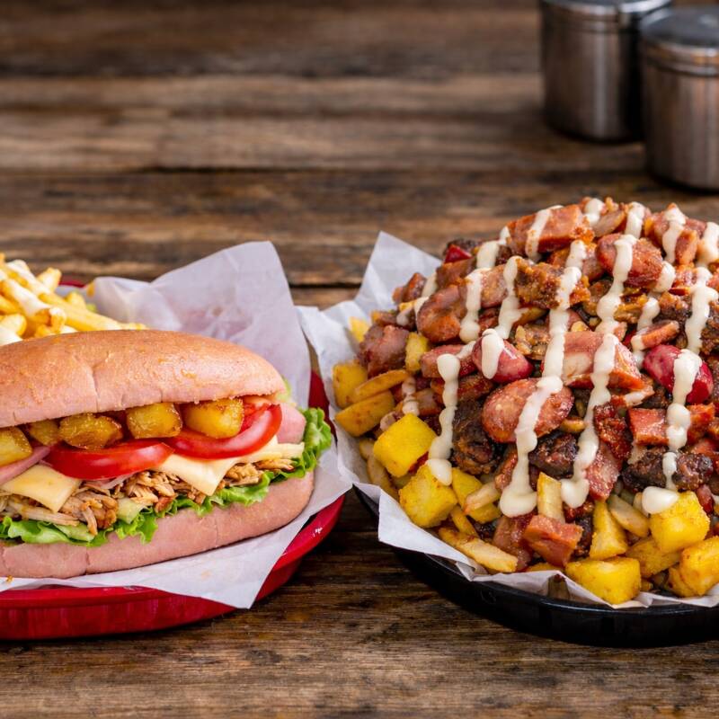 Colita la rebelde, pan colita, lechuga, tomate, piña caramelizada, jamon, queso, pollo desmechado, porcion de papa, salsa de la casa )y salchipapa la exótica, papa amarilla, papa francesa, salchicha ahumada, tocineta ahumada, jamon, queso, carne hamburgesa , salsa de la casa