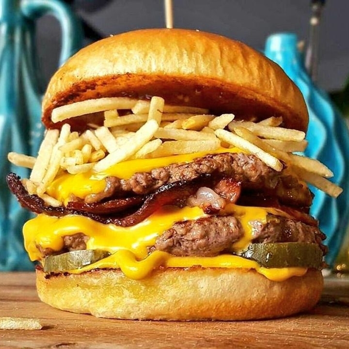 Pan burger, lechuga, tomate, doble carne tipo Angus, ripio, cebolla caramelizada, doble queso, salsa de la casa, tocineta ahumada, jamón, ripio y porción de papa.