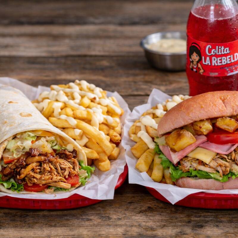 Fajita la fina, tortilla, ripio, pollo desmechado, lechuga, tomate, queso, cebolla caramelizada, porcion papa y colita la rebelde, pan colita, lechuga, tomate, piña caramelizada, jamon, queso, pollo desmechado, porcion de papa, salsa de la casa