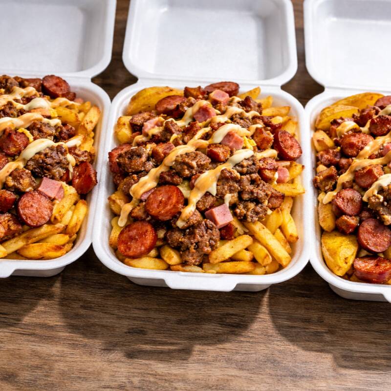 3 Mini salchipapa, papa amarilla, papa francesa, salchicha ahumada, tocineta ahumada, jamón, queso, carne hamburguesa y salsa de la casa.