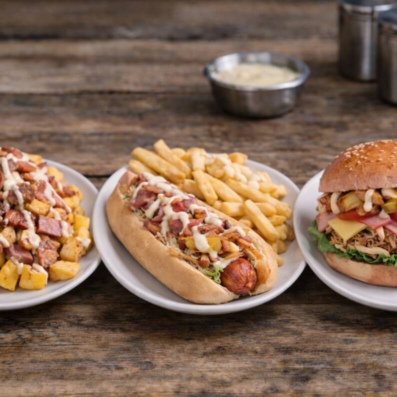 Pan perro, salchicha tradicional, ripio, cebolla caramelizada, queso, salsa de la casa, jamón y tocineta y porción de papa.