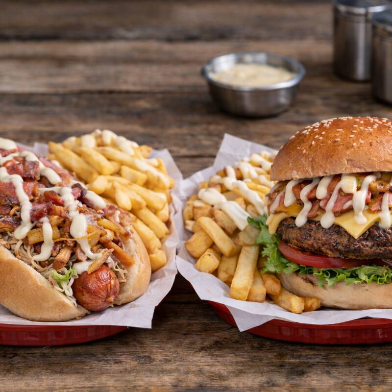 Perro el consentido, pan perro, salchicha tradicional, ripio, cebolla caramelizada, queso, salsa de la casa, jamon y tocineta y porcion de papa y hamburguesa tentacion Pan buger, lechuga, tomate, carne hamburguesa tipo angus, ripio, cebolla caramelizada, queso, salsa de la casa ripio y porcion de papa