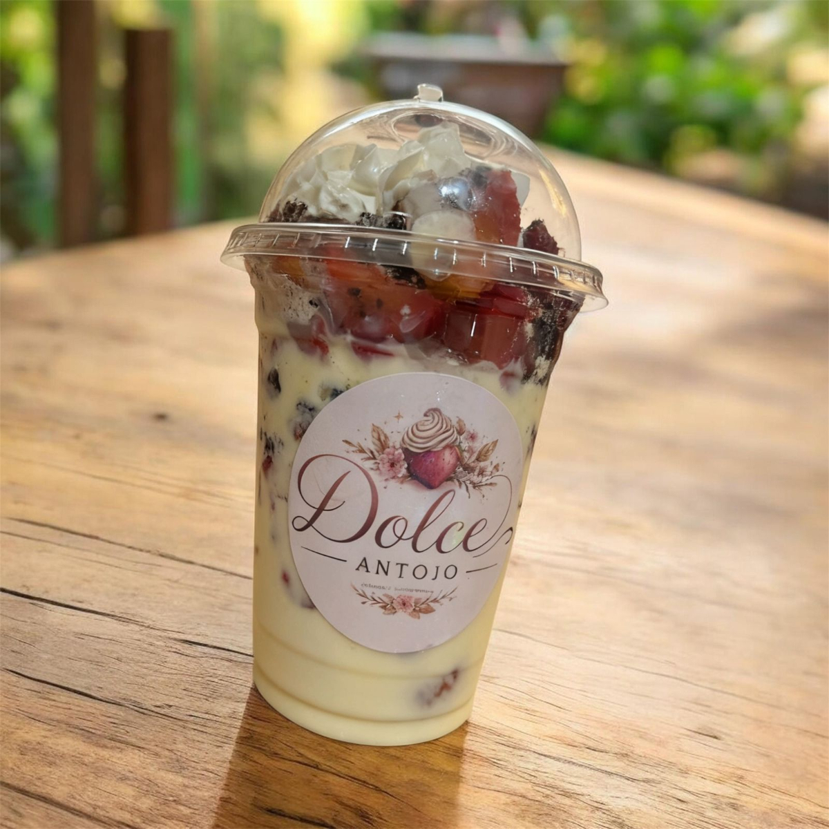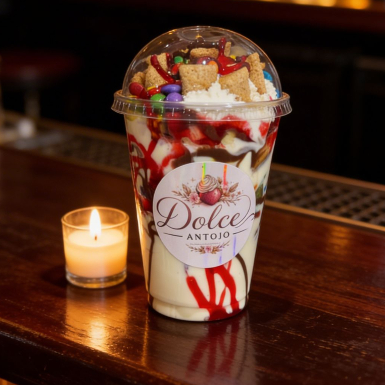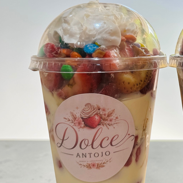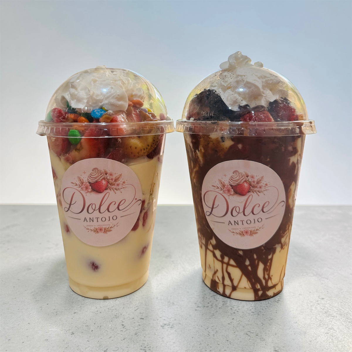 fresas con crema, salsa de chocolate, leche condensada con grageas de chocolate y oreo triturado