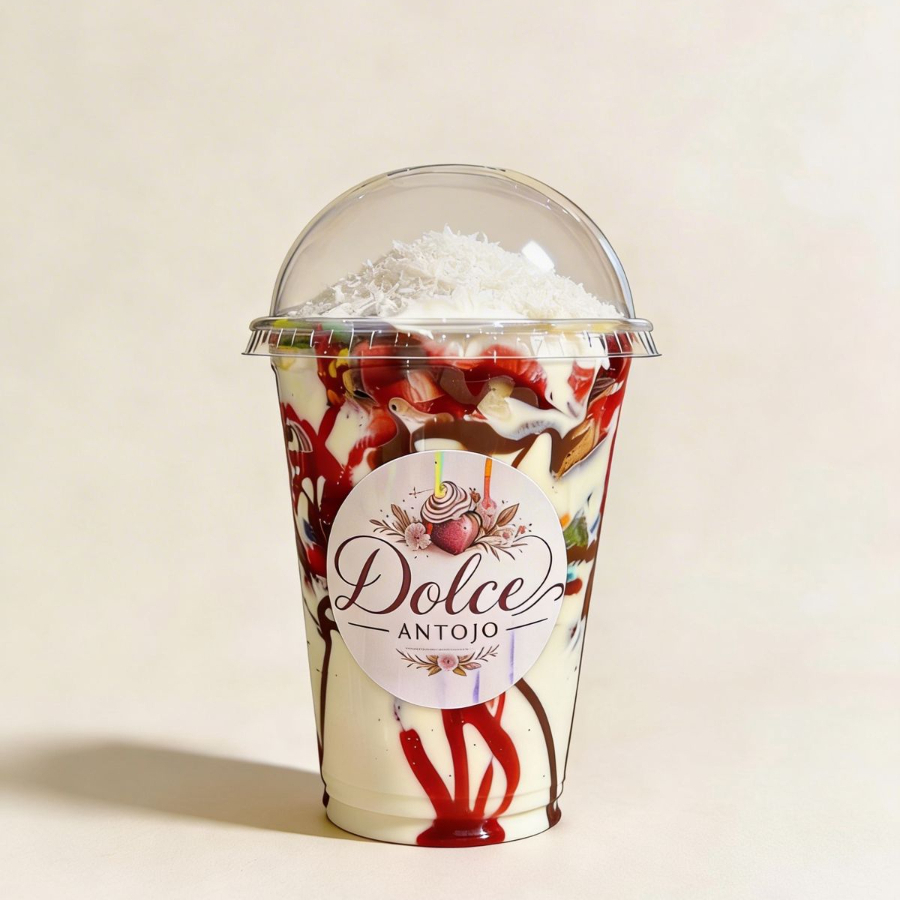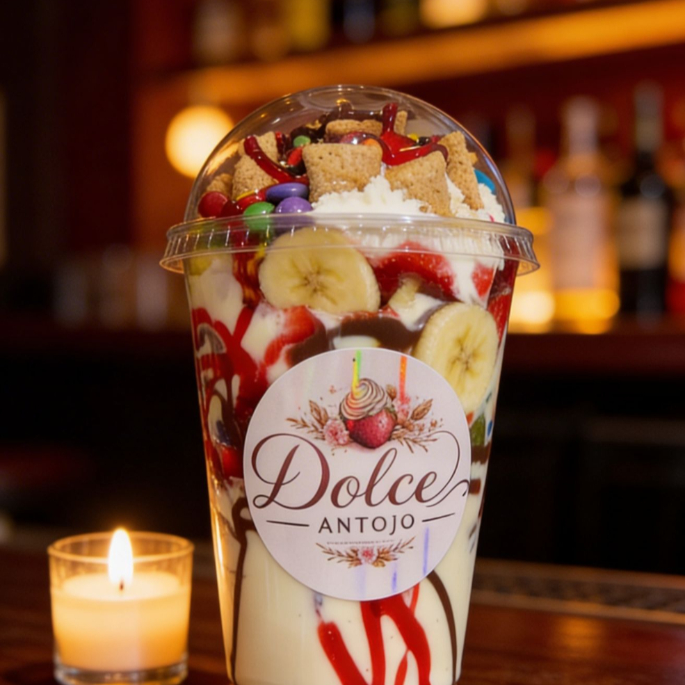 fresas con crema con banano rebanado, flips, grageas de chocolate, salsa de chocolate y fresa