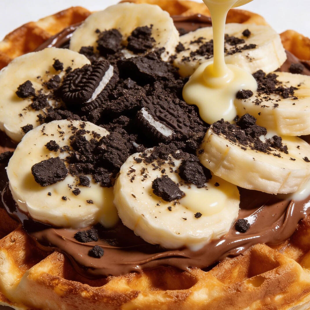 mini waffle con base de nutella, banano rebanado, oreo triturado y leche condensada