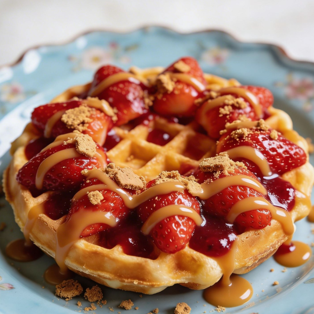 Mini waffle, fresa rebanada, salsa de fresa, leche en polvo