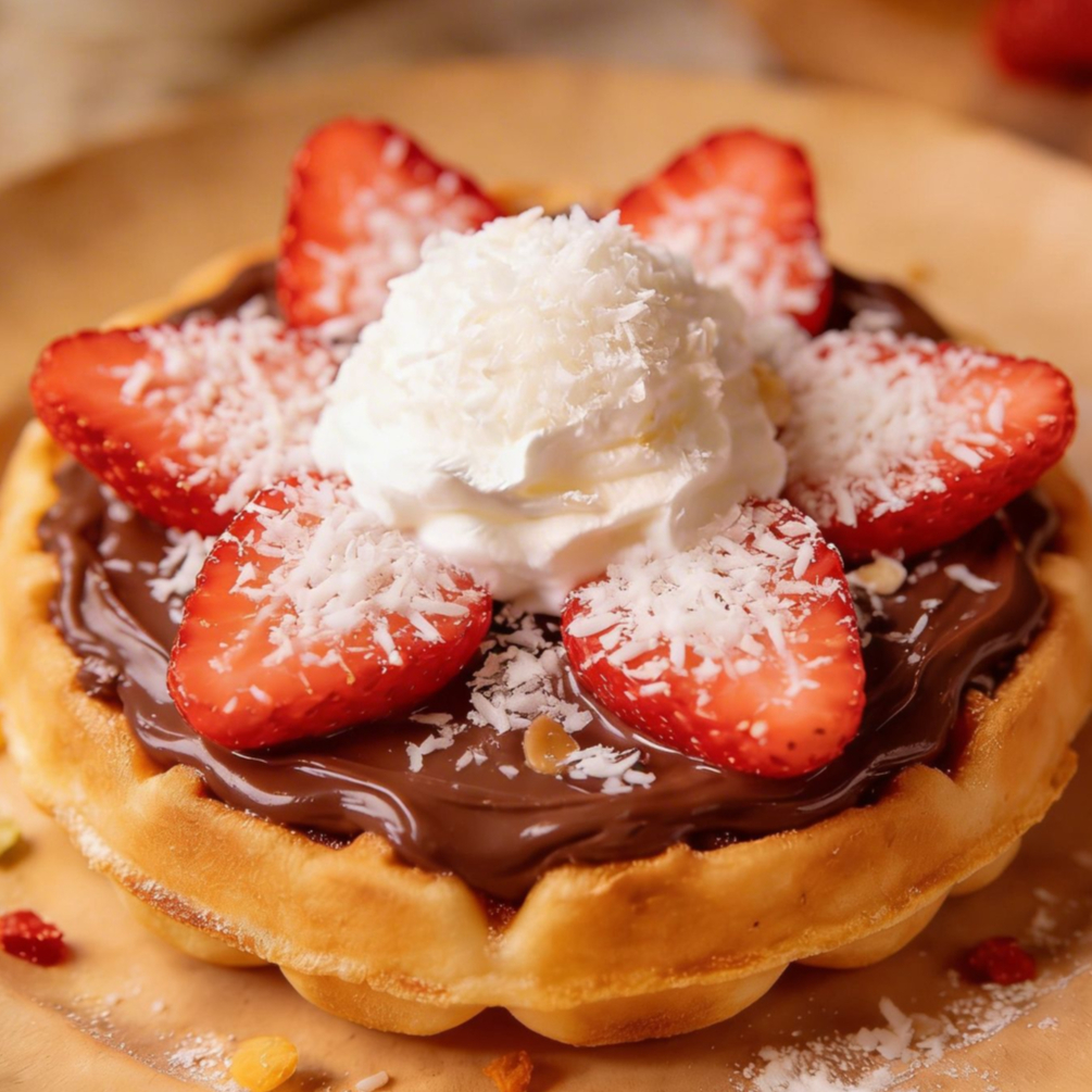 Mini waffle con base de nutella fresa rebanada, leche condensada, coco simple y crema chantilly