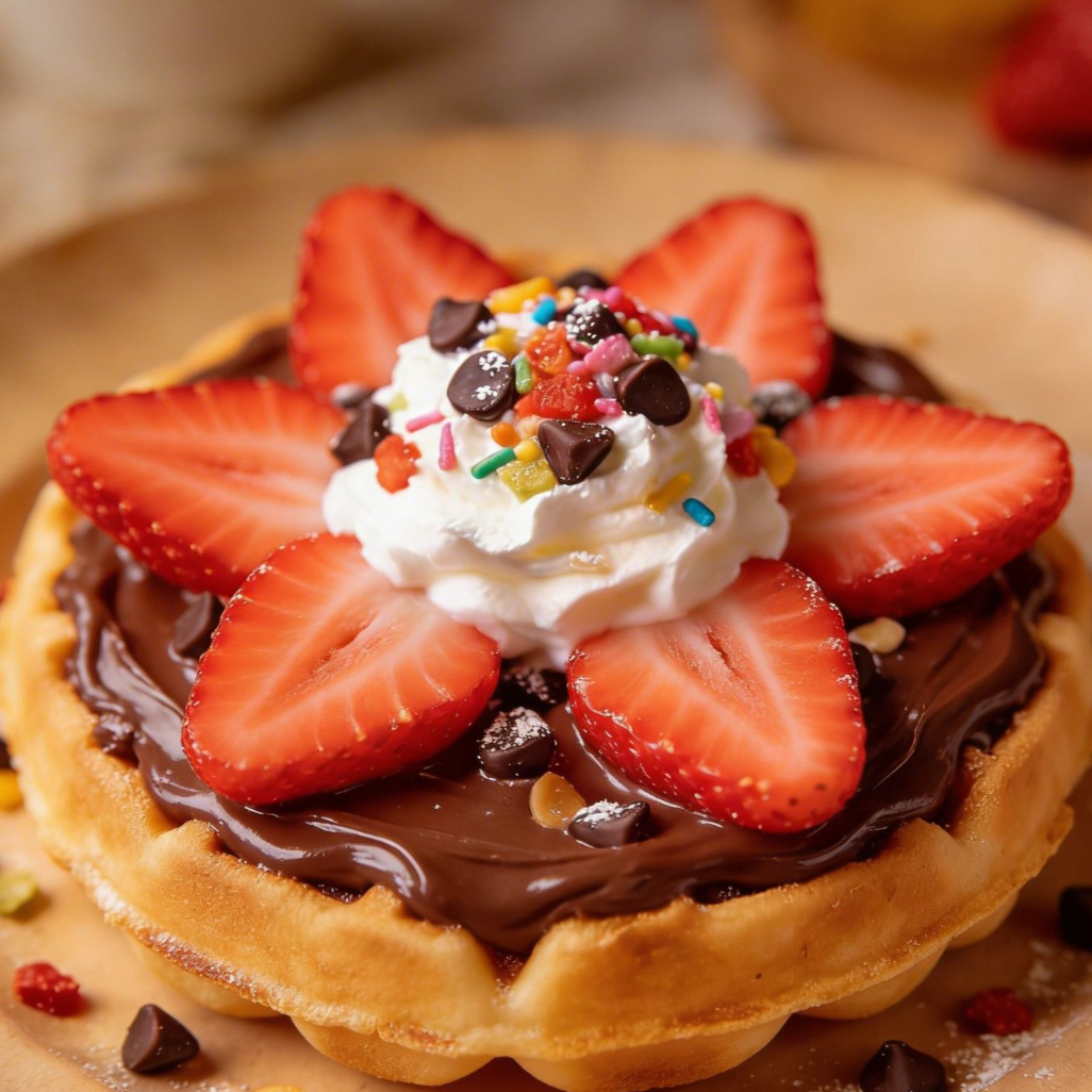 Mini waffle con base de chocolate, fresa rebanada, chips de chocolate y crema chantilly