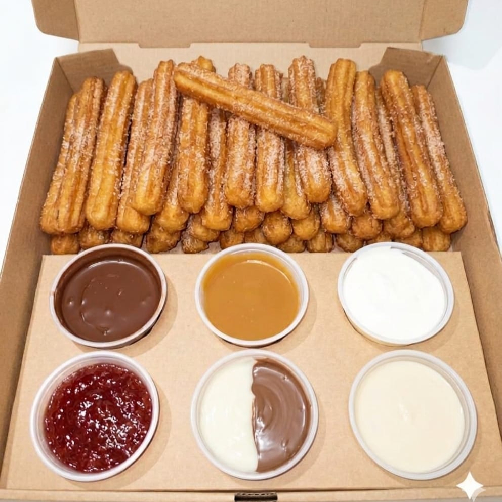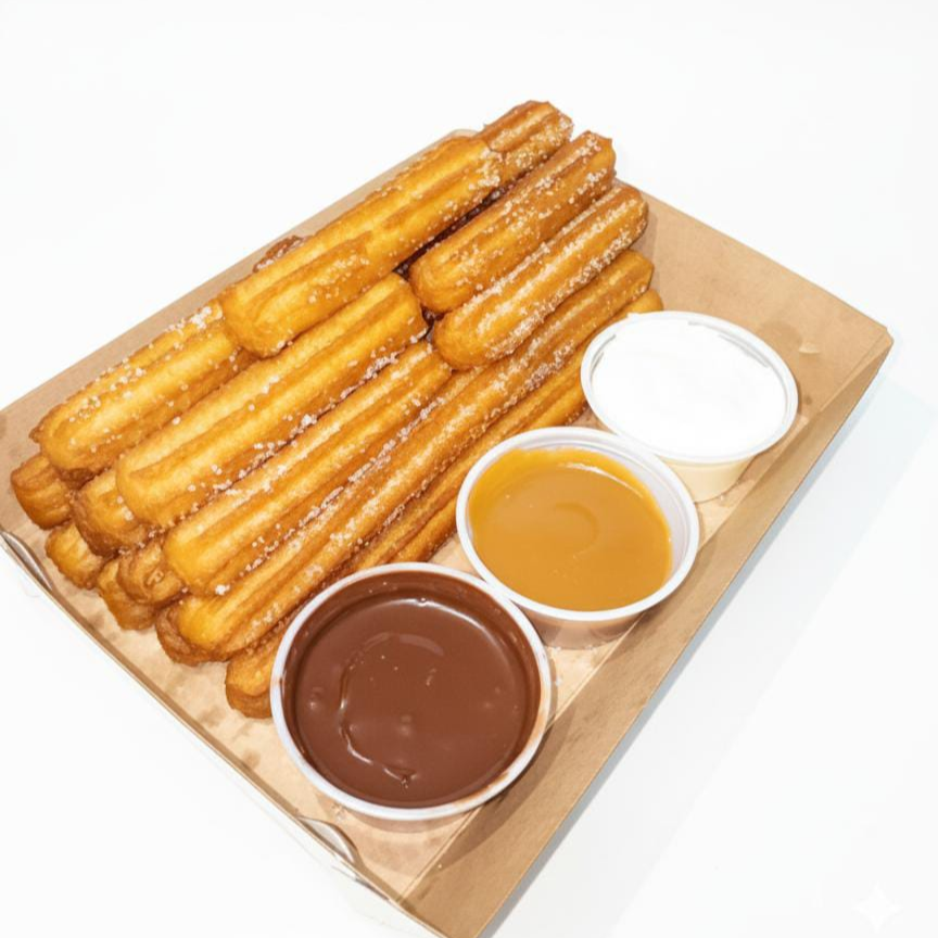 25 Churros de 10 cm espolvoreados con azúcar y acompañados de 3 salsas para untar.
