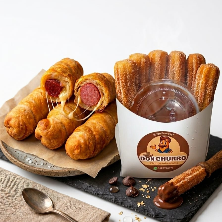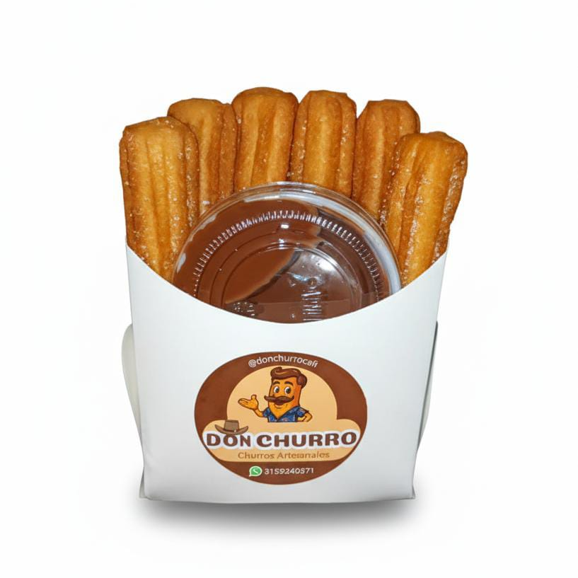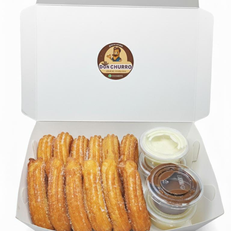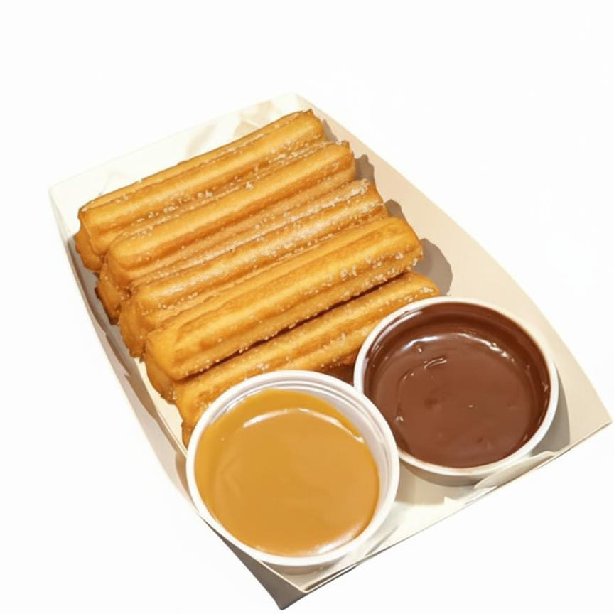 12 Churros de 10 cm espolvoreados con azúcar y acompañados de 2 salsas para untar.