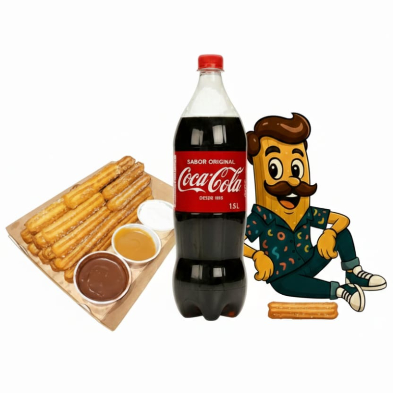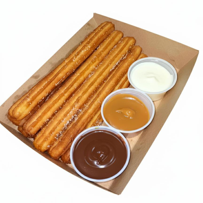 12 Churros de 20 cm espolvoreados con azúcar y acompañados de 3 salsas para untar.