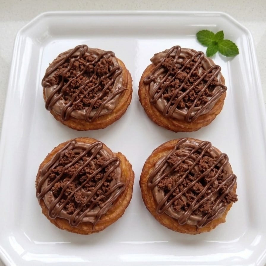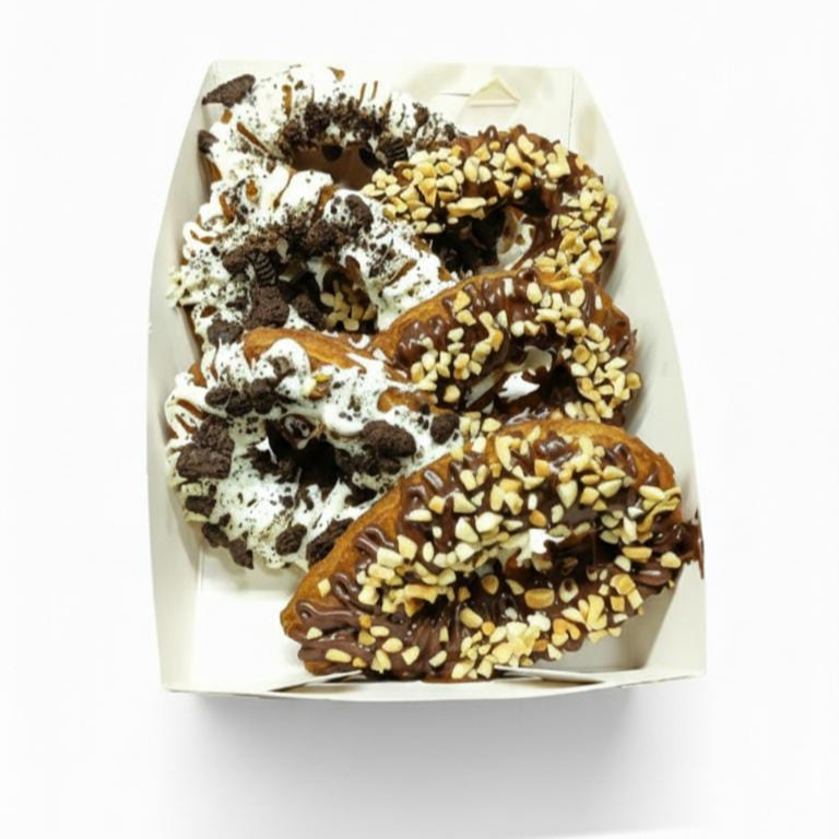 4 Churros en forma de espirales, decorados con crema de chocolate, 2 toppings a elección y glaseado de chocolate.