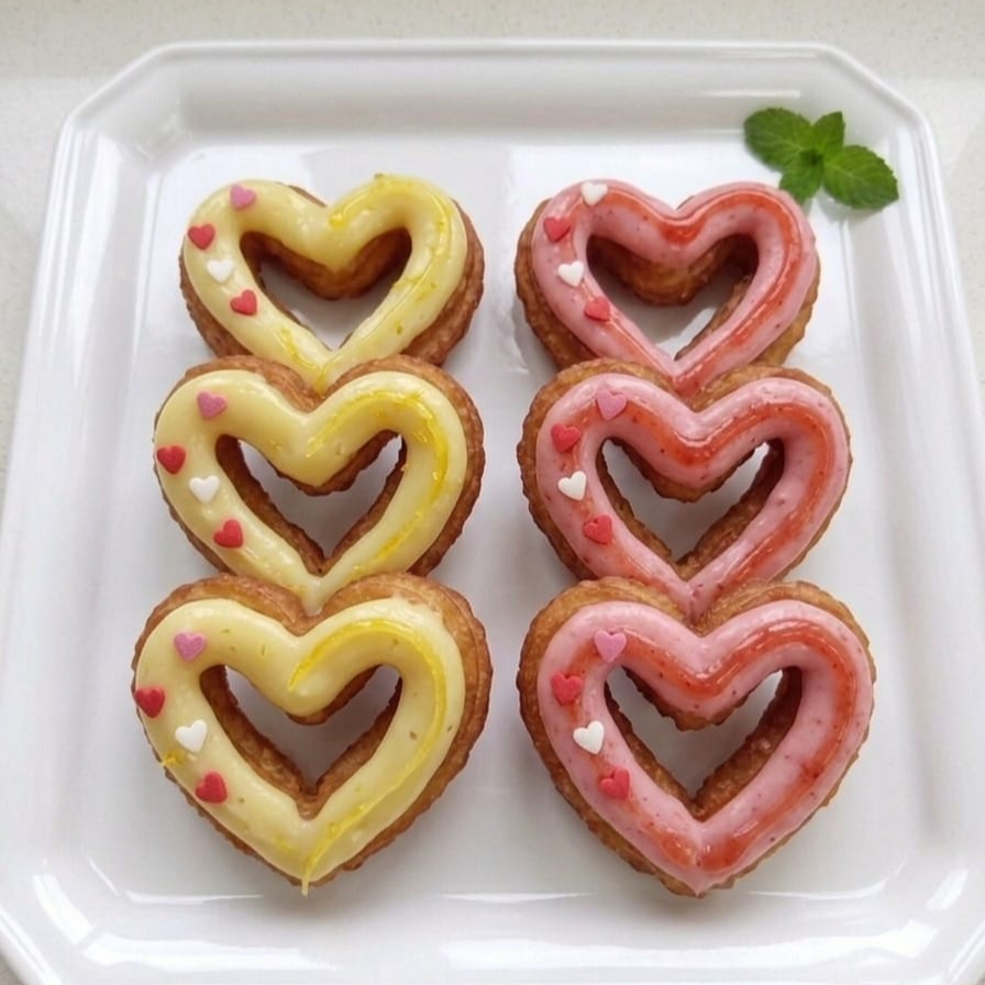 6 Churros en forma de corazones, decorados con crema de limón y nata, glaseado y toppings de sprinkles.