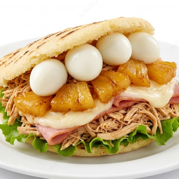 Acompañada de piña calada, queso, jamón, pollo, lechuga, huevo de codorniz.
