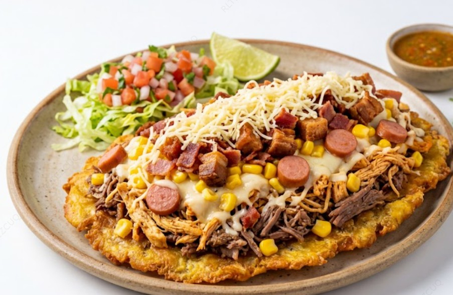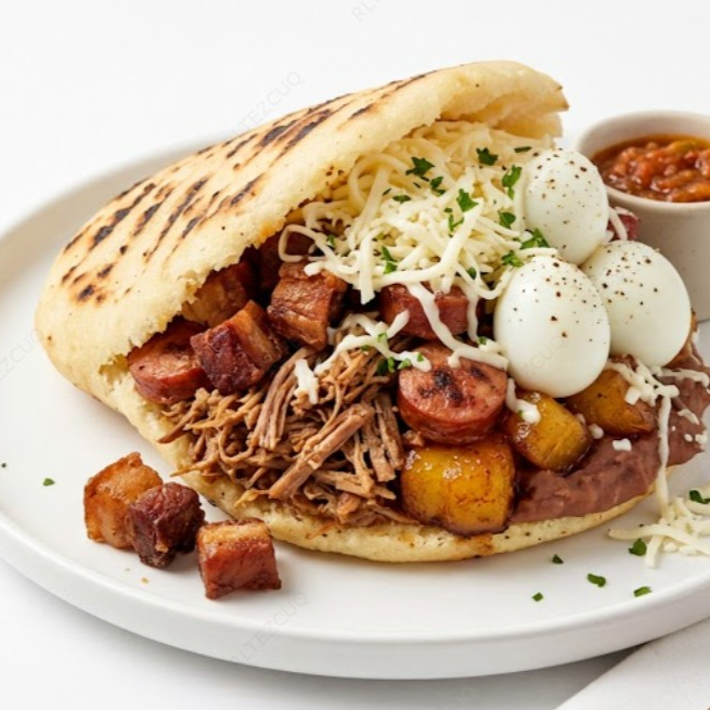 Acompañada de carne, chicharon, chorizo, madurito, frijol refrito, queso, huevo de codorniz.