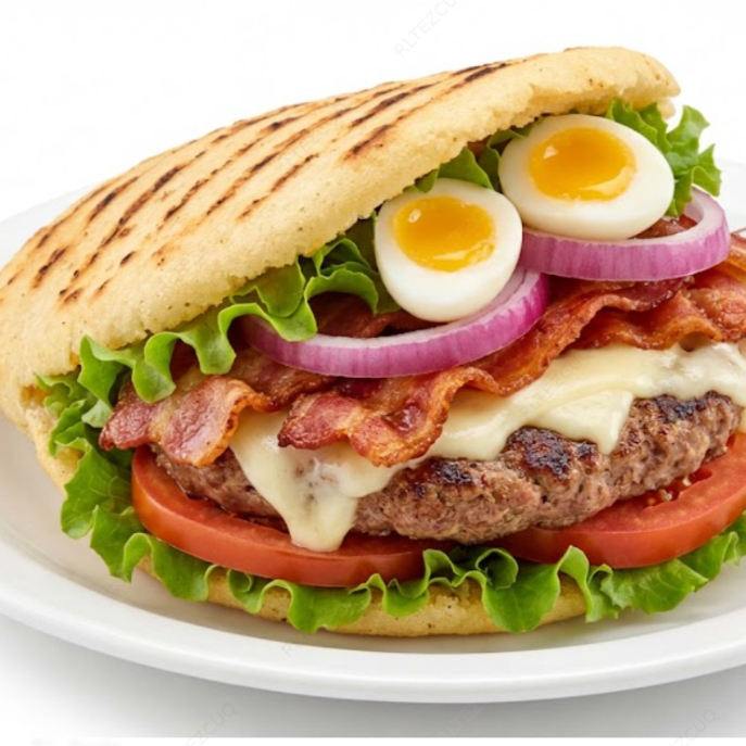 Acompañada de carne de hamburguesa de la casa, tocineta, lechuga, tomate, cebolla, queso, huevo de codorniz.