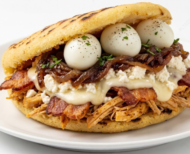 Acompañada de pollo, tocineta, queso, queso, cebolla caramelizada, huevo de codorniz.