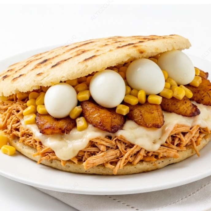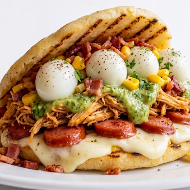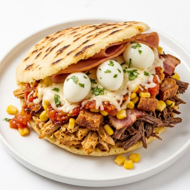Acompañada de pollo, carne, chicharrón, tocineta, maicitos, hogao, jamón, queso, huevo de codorniz.