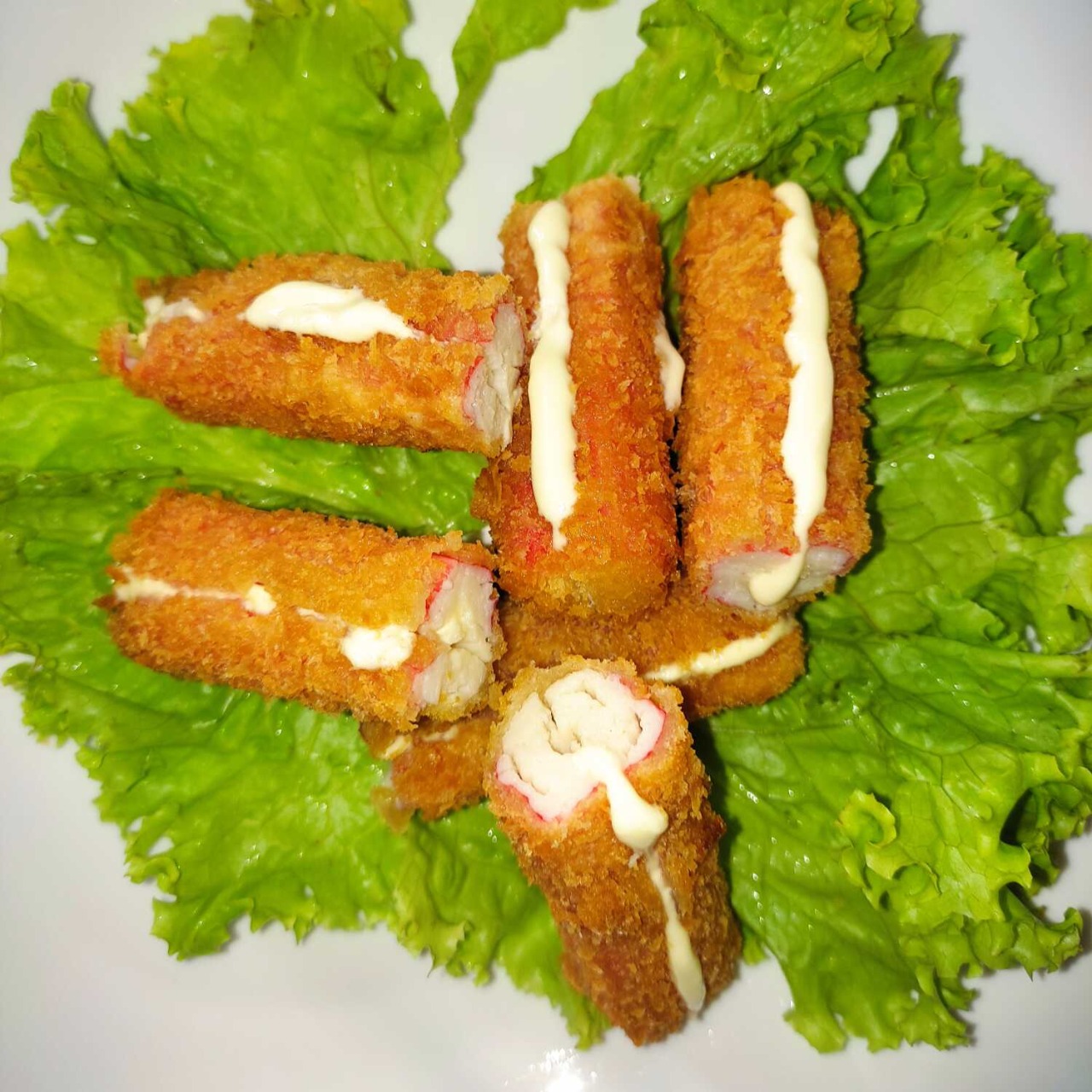 palmitos de cangrejo tempurado, rellenos de queso crema.
