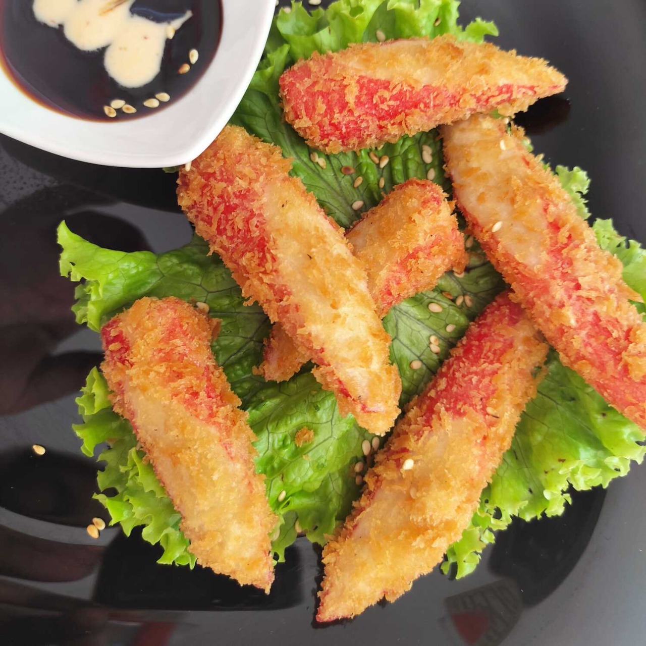 palmitos apanados acompañados de salsa teriyaki.