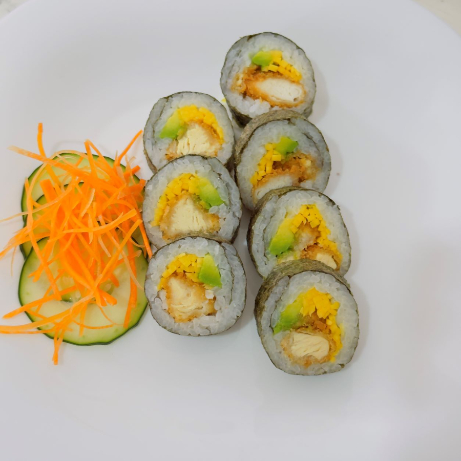 10 bocados de sushi de pollo crispy, aguacate, mango acompañado de salsa teriyaki.