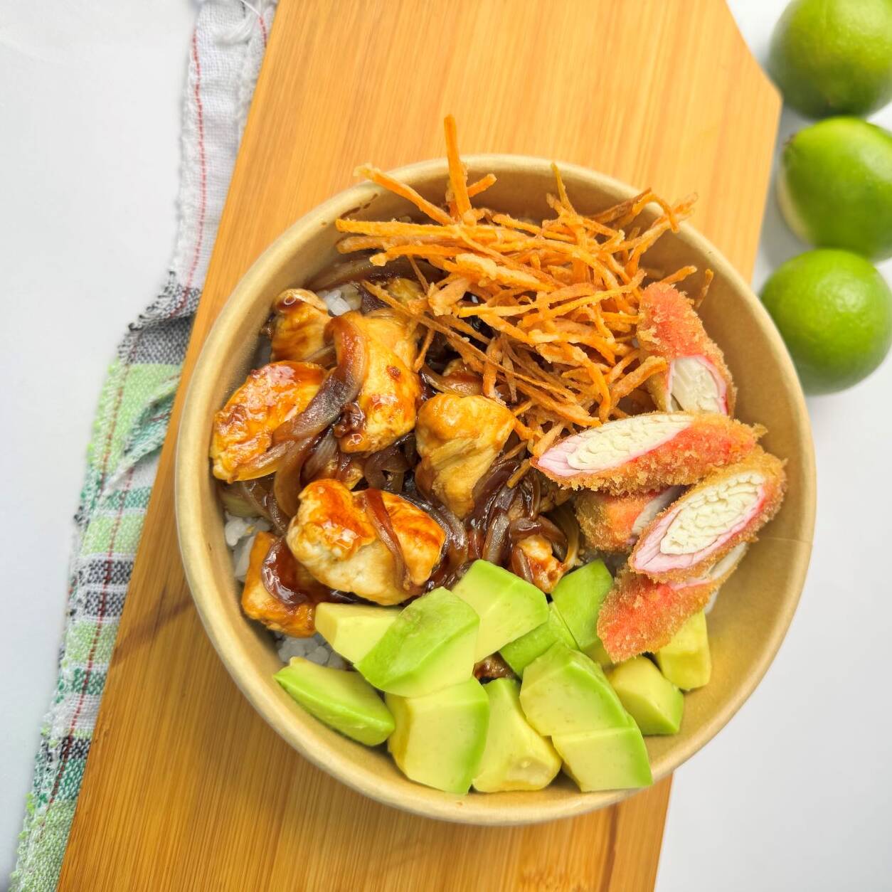 base de arroz de sushi, pollo teriyaki, tomate cherry, zanahoria crispi, palmito tempura y aguacate, acompañado de salsa teriyaki